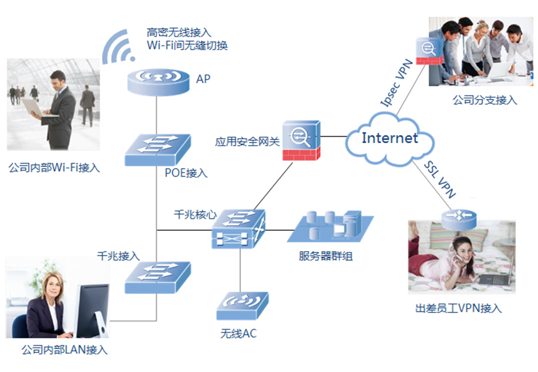 1、有线无线一体化网络覆盖,员工可随时随地联网办公